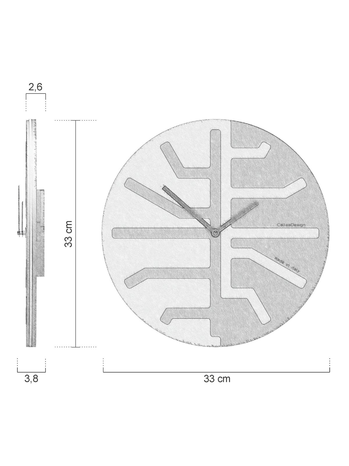 The wall clock measures 33 x 33 x 3,8 cm, designed and entirely manufactured in the Calleadesign workshop in Trieste, Italy.